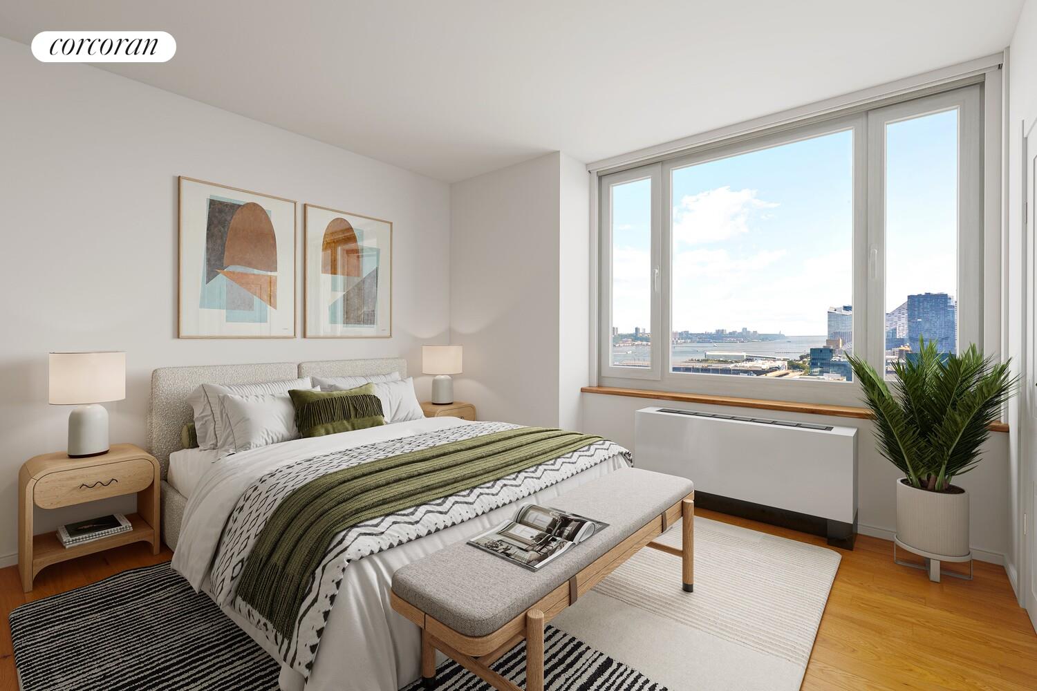Perched on the 20th floor of the renowned Atelier Condominium, Residence E20 offers breathtaking panoramic views of the Hudson River and New York City skyline through dramatic floor-to-ceiling windows. This oversized one-bedroom, one-bathroom home delivers the perfect blend of natural light, open space, and refined finishes in the heart of Midtown West.