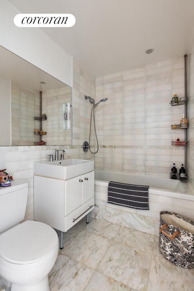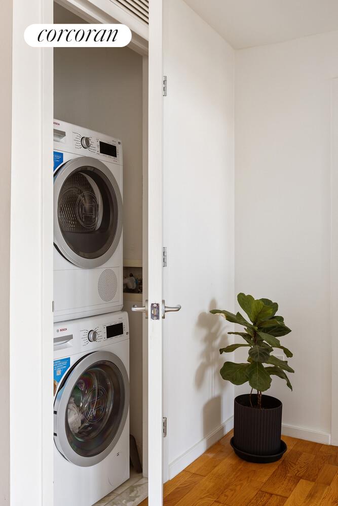 The king-sized bedroom provides excellent closet space and peaceful city views. The bathroom is spa-inspired, featuring elegant marble surfaces and upscale finishes. Additional highlights include wide-plank white oak flooring, an in-unit washer and dryer, and central climate control for year-round comfort.
