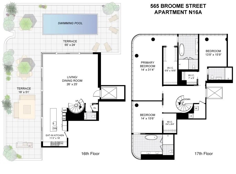 Residence N16A at 565 Broome SoHo is a 3-Bedroom, 3.5-Bathroom, 3,397 SF interior and 2,200 SF exterior duplex offering nearly 5,600 square feet of exquisitely designed indoor-outdoor living. Conceived by the renowned Renzo Piano, this rare downtown gem opens directly from private elevator access into an expansive living room wrapped in floor-to-ceiling glass. Sliding doors lead to a sweeping terrace with a heated saltwater pool, a fully equipped outdoor kitchen, and panoramic open city views - creating the ultimate backdrop for both grand entertaining and intimate al fresco dining.