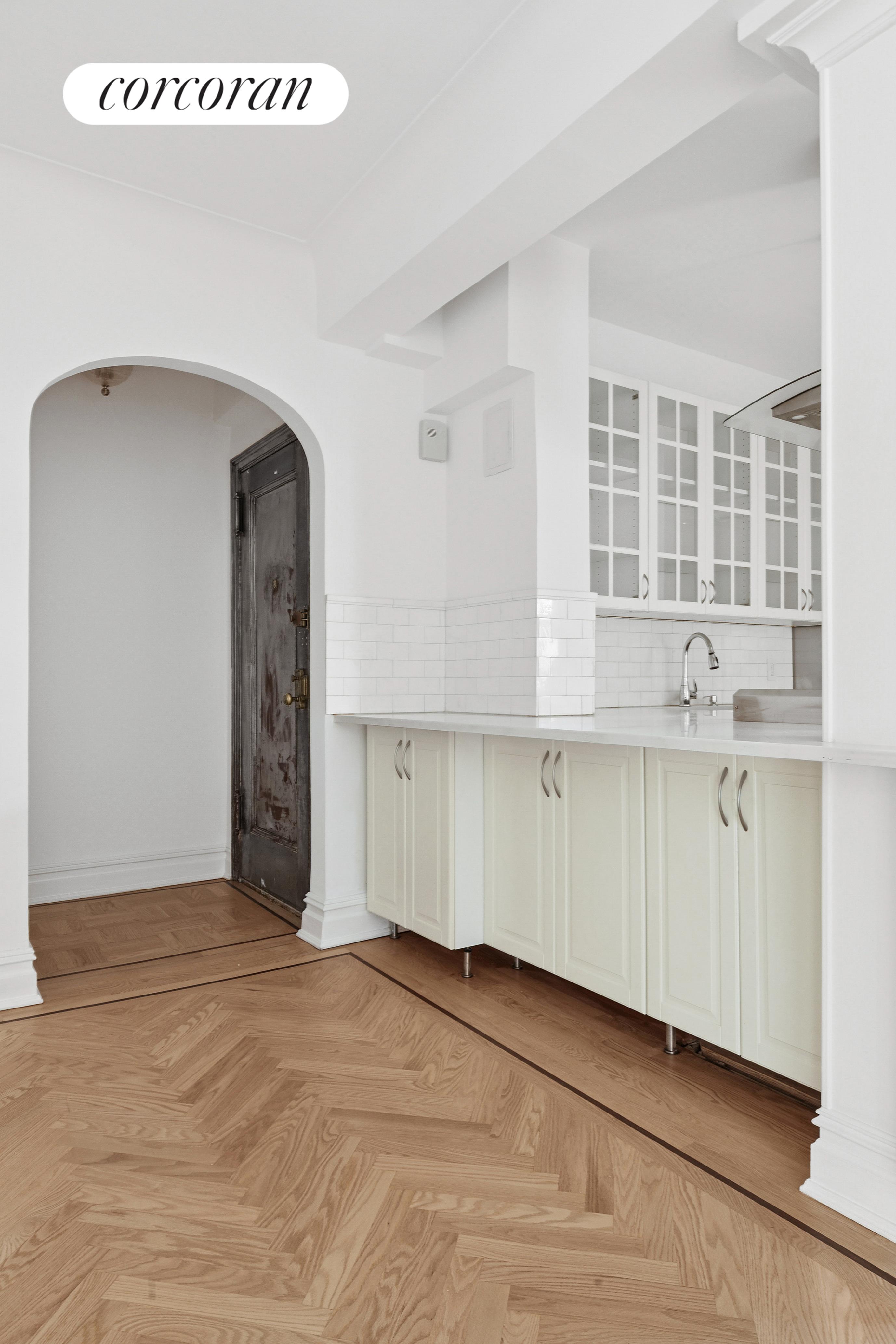 Perched on a high floor and drenched in sunlight from oversized south-facing windows overlooking Straus Park. Greeted by solid herringbone oak floors, original moldings, and high beamed ceilings that give the home its classic charm. The open chef's kitchen features Corian countertops and has abundant storage and counter space. The living and dining area flows easily, while still offering a natural sense of separation.