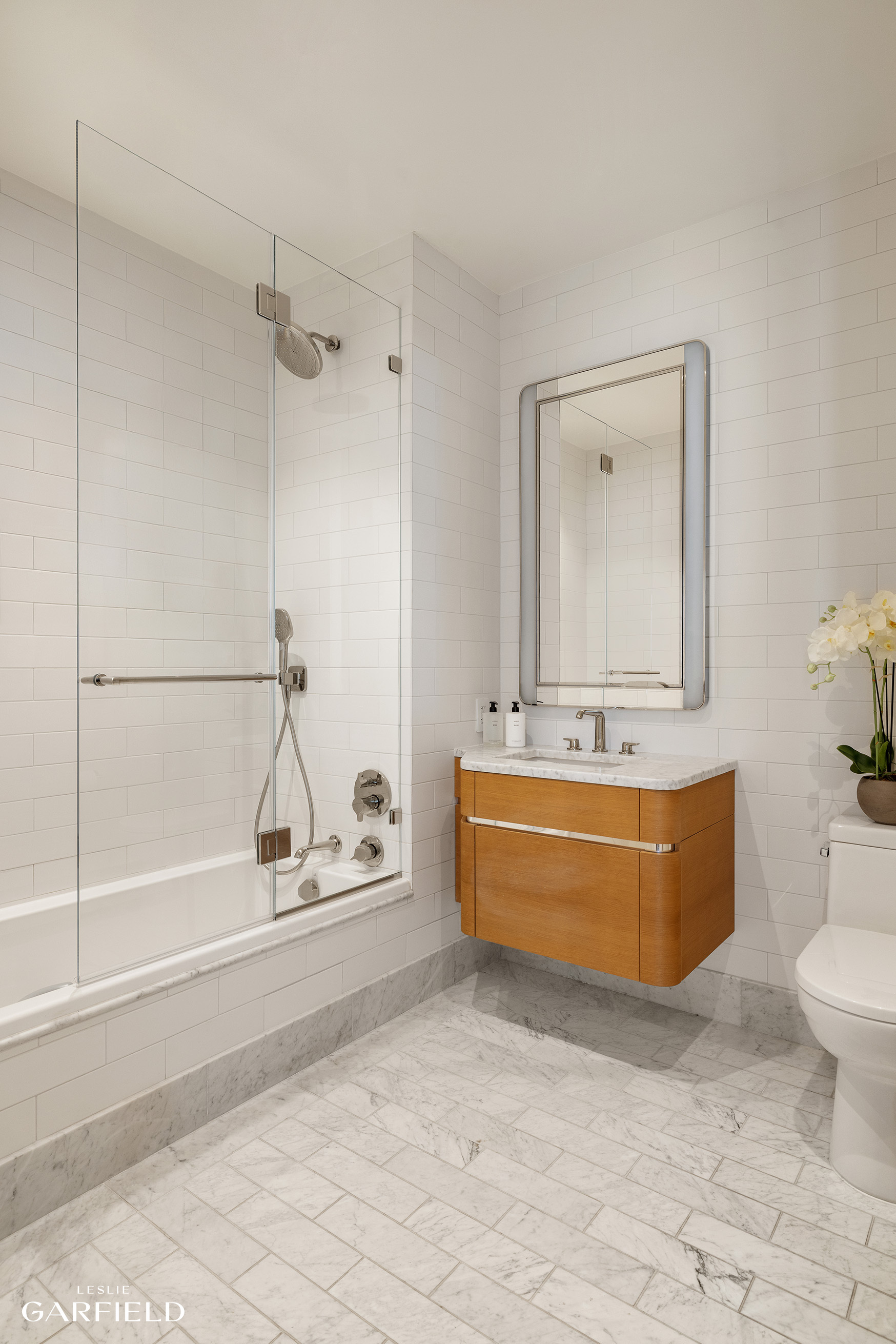 Residents enjoy 24-hour white-glove service, a live-in superintendent, fitness and yoga studios, a children’s playroom, bike storage, a sky lounge, and an expansive rooftop terrace with sweeping views of the Hudson River and Manhattan skyline.