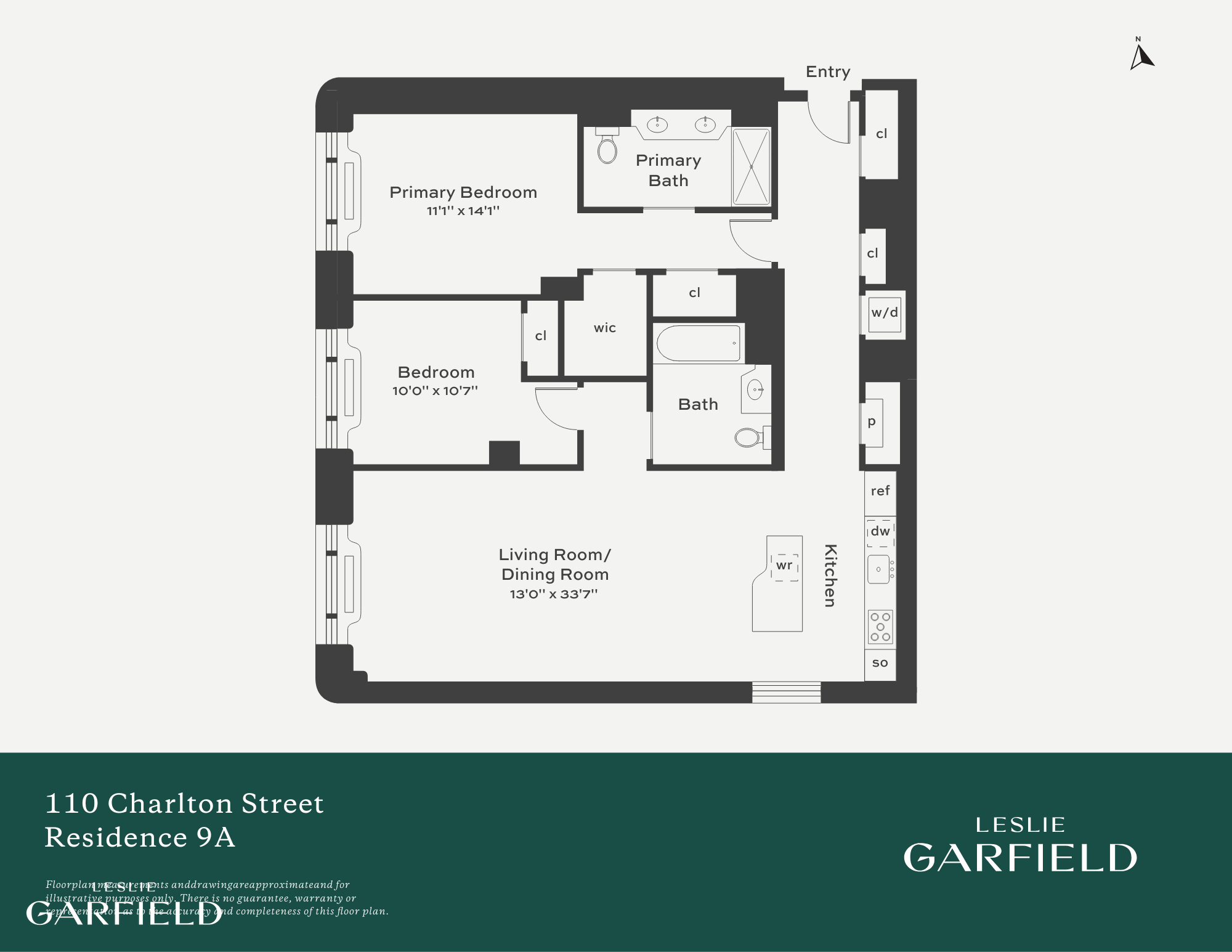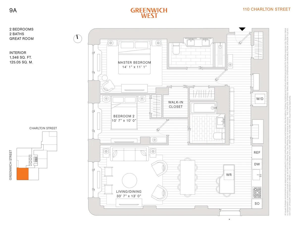 Residence 9A at Greenwich West is a beautifully proportioned two-bedroom, two-bathroom condominium with open western exposures overlooking Greenwich Street. The thoughtful layout features a gracious entry foyer leading to a 33-foot-long great room with a windowed kitchen and bright entertaining space. Oversized casement windows flood the home with natural light, highlighting wide-plank European white oak floors and bespoke Parisian design by architect Sébastien Segers.