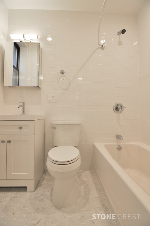 The windowed kitchen is tastefully renovated with full-sized stainless steel appliances, dishwasher, microwave, stone countertops, marble backsplash, and grey slate floorsalong with generous cabinet storage. Kitchen pics are from a different unit but reflects the finishes.