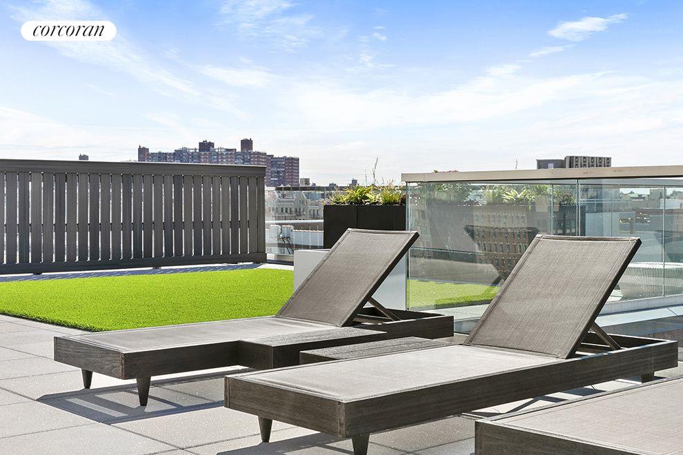 An expansive, fully furnished and landscaped roof deck overlooking Brooklyn and Manhattan