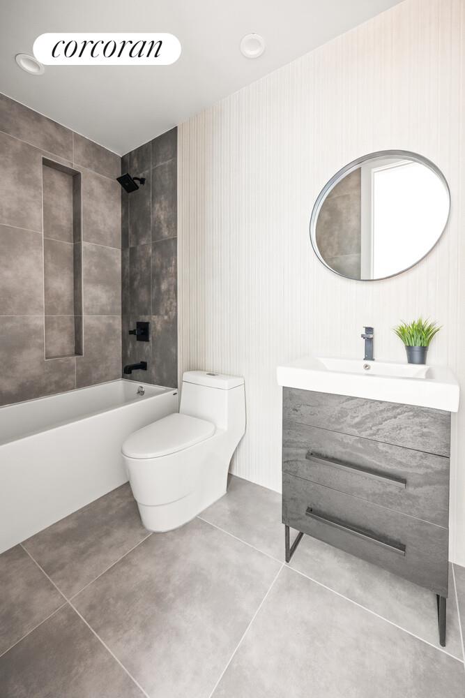 The bedroom comfortably fits a king-size, while the spa-like bathroom is a serene retreat with grey tile, radiant heated floors, a double vanity, oversized LED mirror, and a deep soaking tub.