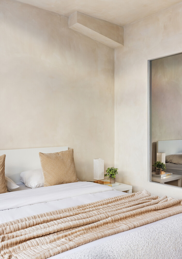 Residence 3C, the largest alcove studio in the building, features serene lime-washed walls and ceilings, a stainless-steel kitchen with top-of-the-line appliances, a dining area, office nook, fully built-out closets for ample storage, and an in-unit washer/dryer.