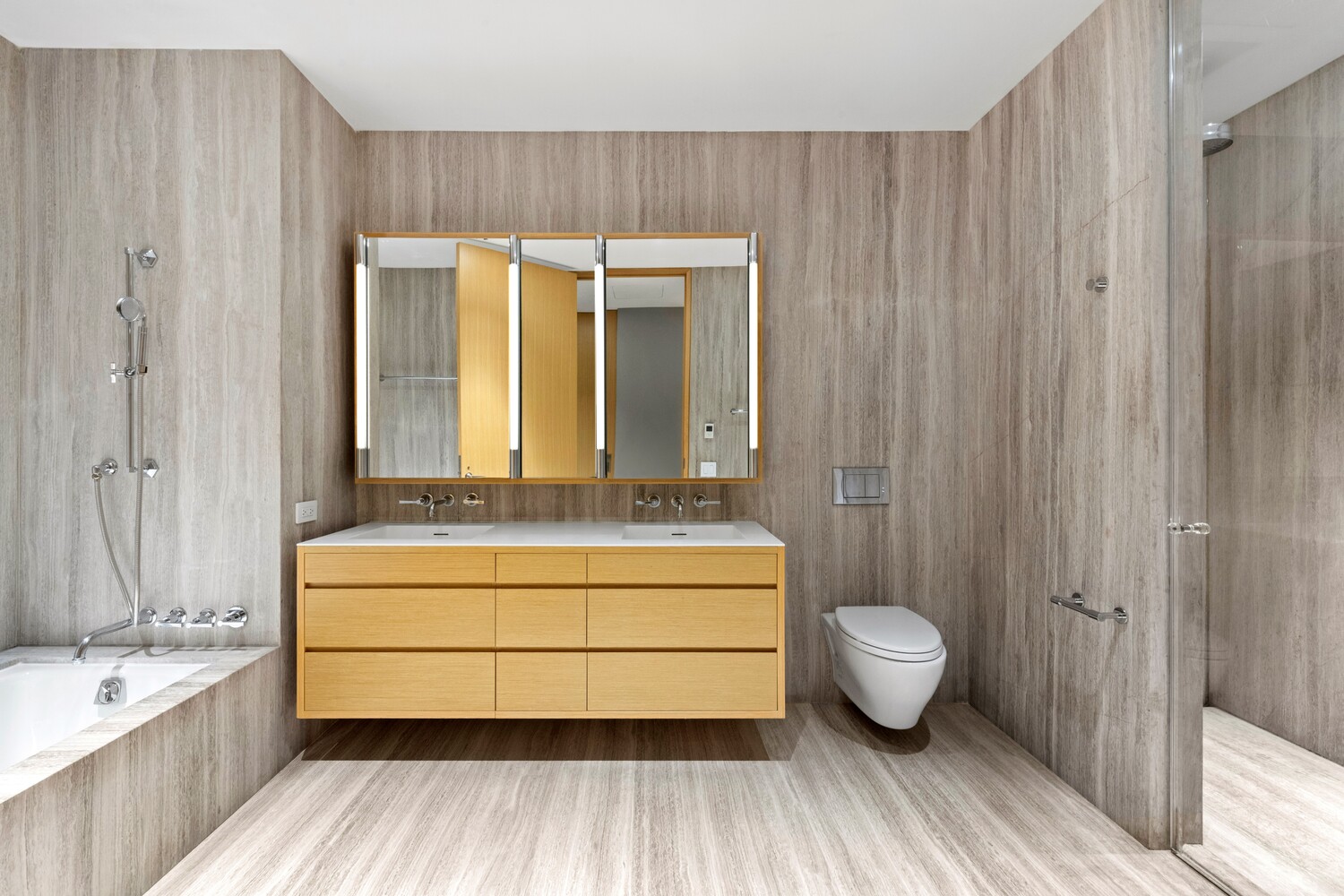 A thoughtful split-bedroom layout ensures privacy, with all three bedrooms positioned away from the entertaining spaces. Each bedroom features its own en-suite bathroom and direct access to the wraparound terrace. The primary bedroom comfortably fits a king-sized bed and includes a luxurious walk-in closet. The primary bath features a floating double vanity, oversized walk-in rain shower, and a deep soaking tub. Bedrooms two and three are equally spacious, each with ample closet space and room for additional storage. Wide-plank light oak hardwood floors throughout complement the natural light from northern and southern exposures.