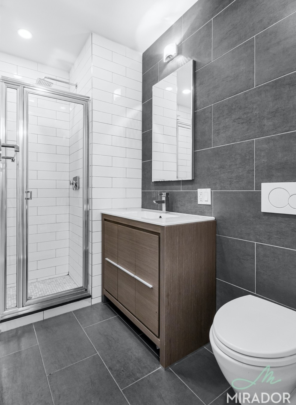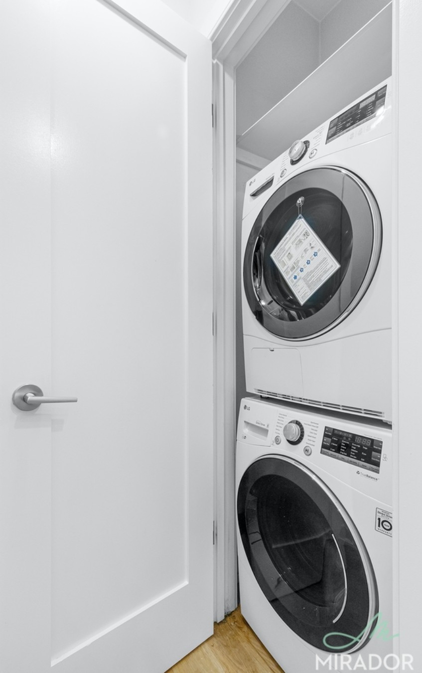 The open kitchen has full sized appliances w/ dishwasher and microwave. Plus a high end bathroom with custom finishes and full sized laundry in unit and built in AC units