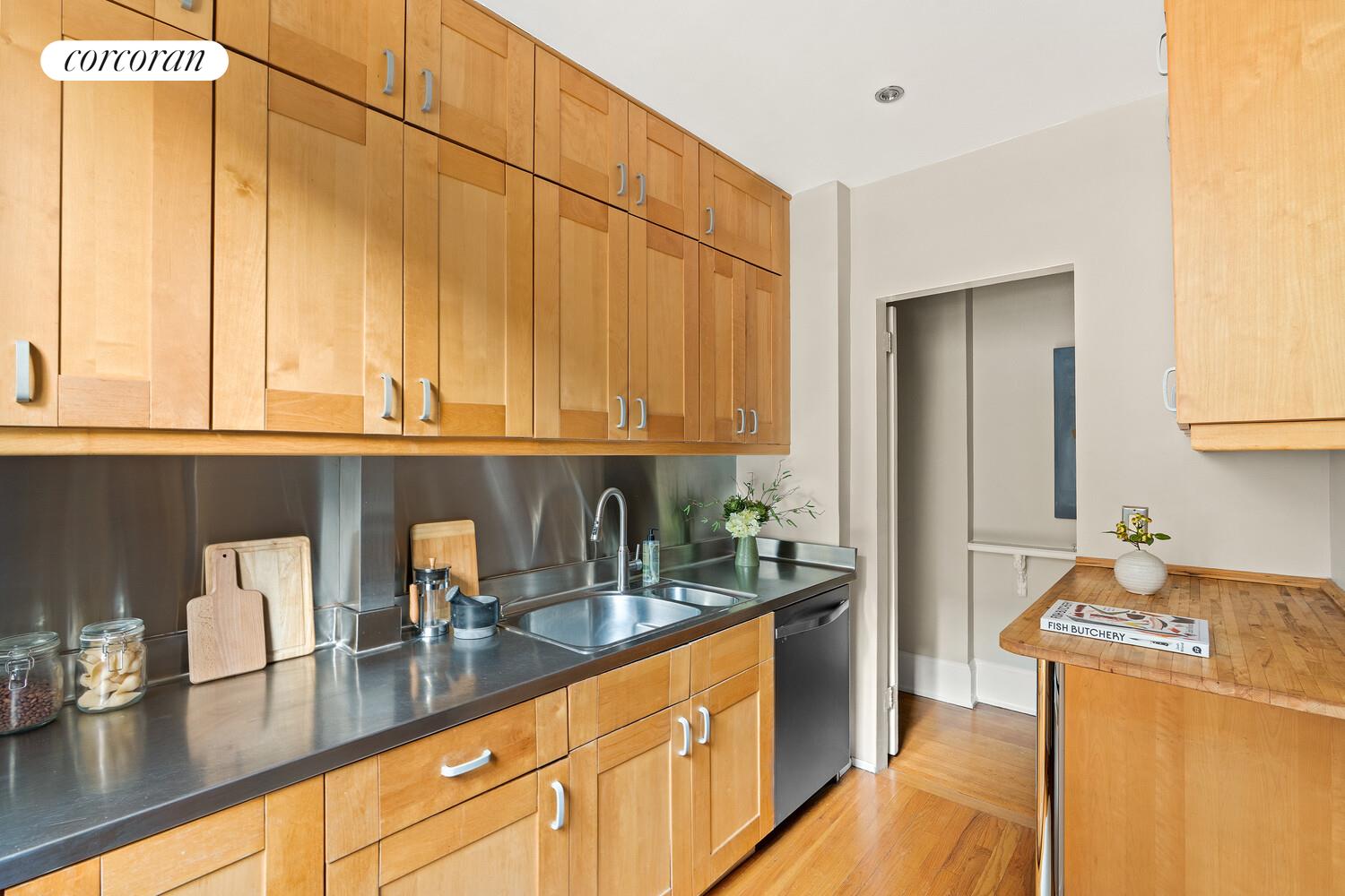 The windowed kitchen is both practical and inviting, featuring maple cabinetry, stainless steel countertops, and a suite of modern appliances. Each bedroom enjoys generous space, and oversized closets, with the primary offering two exposures. The bath is finished in classic white tile and polished chrome. Storage unit transfers with the sale.