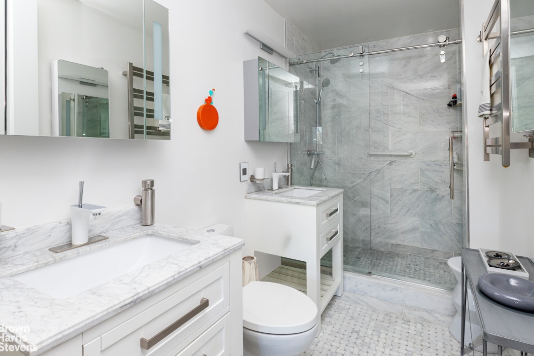 The tranquil primary suite features paneled walls, integrated reading lights, and motorized Hunter Douglas shades. A fully customized walk-in closet offers both function and flexibility, while the oversized bedroom easily accommodates a king-size bed, desk, or fitness equipment. The en-suite bath includes dual marble-topped vanities, a glass-enclosed shower with chrome fixtures and grab bar, and a towel warmer for a touch of luxury.