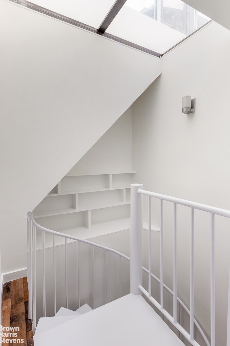 A skylit spiral staircase connects the levels, flooding the home with natural light and adding a sculptural element to the space. The upper-level functions beautifully as a private guest suite or secondary primary, complete with a walk-in closet, en-suite bath with stall shower, and concealed GE washer/dryer. A raised platform along the window line provides additional lounge space and expands the room to create a decadent private suite.