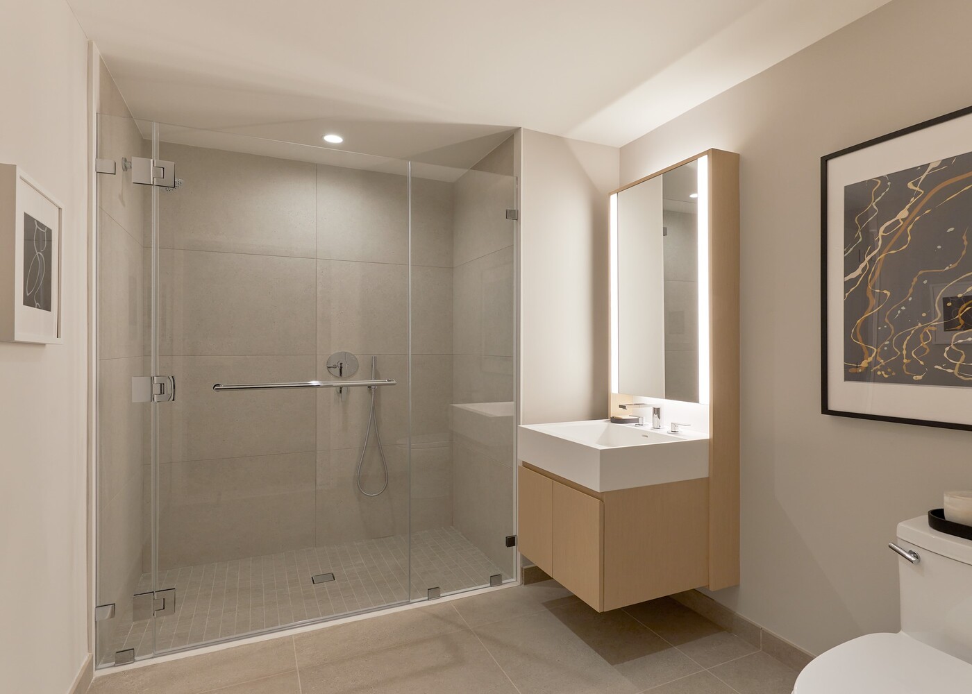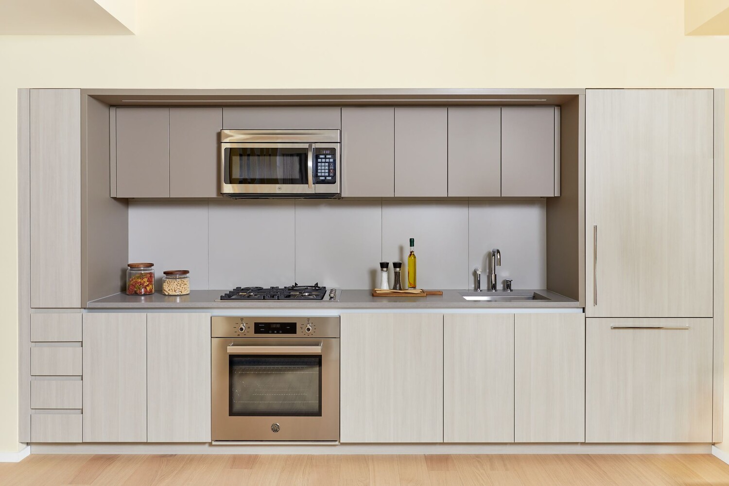 Residences boast custom kitchens, framed in warm wood capped with sleek quartz countertops, and seamlessly integrated Bosch appliances blend with impeccable millwork and counter-to-cabinet porcelain backsplashes, balancing perfect functionality with pure elegance.