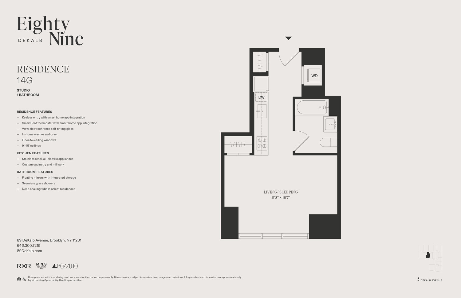 Ideally located at the nexus of Fort Greene and Downtown Brooklyn, Eighty Nine DeKalb enjoys the best of both worlds: the charm of a historic neighborhood and the energy and convenience of the city. With glorious panoramas of the Manhattan skyline and natural beauty beyond, this thoughtfully designed building immerses you in everything that makes Brooklyn special.