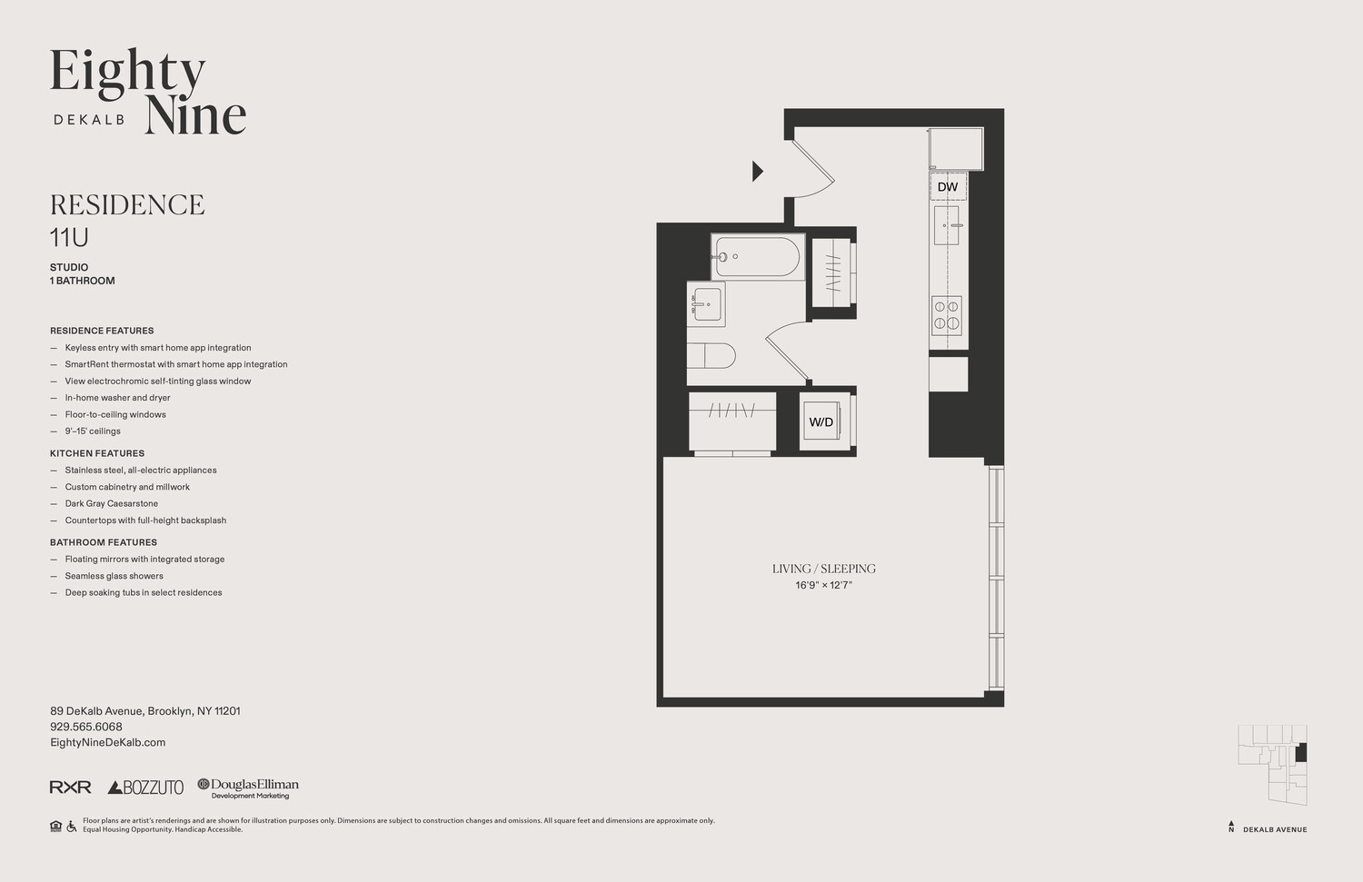 Ideally located at the nexus of Fort Greene and Downtown Brooklyn, Eighty Nine DeKalb enjoys the best of both worlds: the charm of a historic neighborhood and the energy and convenience of the city. With glorious panoramas of the Manhattan skyline and natural beauty beyond, this thoughtfully designed building immerses you in everything that makes Brooklyn special.