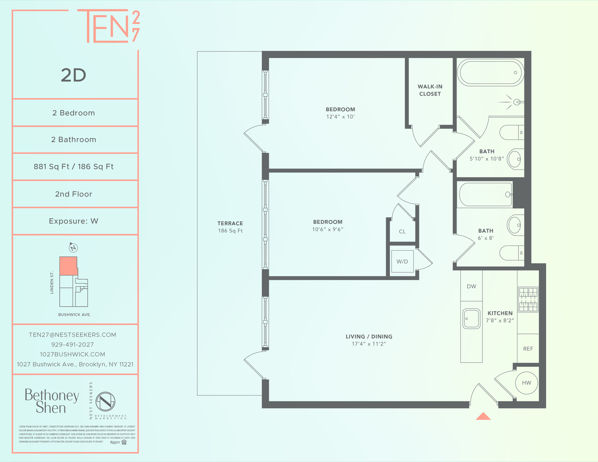 Introducing residence 2D at TEN27— this beautifully crafted home combines an expansive interior with an extensive private outdoor terrace, delivering a refined 2-bedroom, 2-bathroom home in the heart of Bushwick. Spanning 881 square feet of interior space and complemented by a massive 186-square-foot private terrace, this residence offers a modern, generously-proportioned layout ideal for both entertaining and everyday living. Step into this west-facing home welcoming you with abundant natural light through oversized triple-paned windows with screens, enhanced by soaring 11 foot high ceilings and wide-plank oak flooring that accentuates the light-filled open layout. A thoughtfully designed open-concept plan seamlessly connects the kitchen and living space to the private balcony, creating a perfect setting for gatherings or quiet moments of relaxation. The kitchen is a chef’s showcase, featuring fully integrated Bosch appliances including induction cooktop and fully vented kitchen hood, gorgeous quartz countertops with island waterfall and matching quartz backsplash, and custom designed matte gray cabinetry, ideal for the everyday chef or ultimate entertainer. The primary suite offers a private retreat with direct access to the private terrace, a walk-in closet, and a spa-inspired 4-piece en-suite bathroom boasting walk-in shower and separate soaking tub, radiant heated floors, smart toilet, designer floating sink vanity with storage, and porcelain tiling. The secondary bedroom is equally spacious and flexible, and is served by a second full bath with heated floors, smart toilet, custom floating sink vanity, and bronze fixtures. Additional highlights include in-unit Bosch washer/dryer, multi-zone heating and cooling, a smart lock entry system, and abundant storage throughout. TEN27 is a striking contemporary addition to Bushwick, bringing a sense of refined modern living to one of Brooklyn’s most dynamic neighborhoods. Situated on a quintessentially picturesque, tree-lined stretch of Bushwick Avenue, the building blends clean architectural design with a calming, modern-zen atmosphere all while introducing an elevated luxurious, amenitized condo lifestyle to the future residents of this bespoke new 20-unit boutique condominium. Inside, residents enjoy beautifully crafted residences paired with thoughtful amenities, including garage parking, a state-of-the-art fitness center with NordicTrack equipment, a gracious arrival lobby with virtual doorman system for security and convenience, an elevator, and a gorgeous landscaped rooftop featuring BBQ grills, outdoor dining and lounge areas, panoramic Manhattan city skyline views, and private cabanas available for purchase. Perfectly positioned at the crossroads of Bushwick and Bedford-Stuyvesant - and just moments from the M, J, and Z trains —TEN27 puts you within convenient reach of Brooklyn’s best restaurants, nightlife, galleries, shops, and parks, while offering a short 20-minute commute into Manhattan. From savoring a meal at a neighborhood favorite to browsing cutting-edge art at any of the numerous local galleries, shopping at one-of-a-kind vintage boutiques, or enjoying a quiet afternoon in any of the many local parks, TEN27 puts the very best of Brooklyn right at your doorstep.