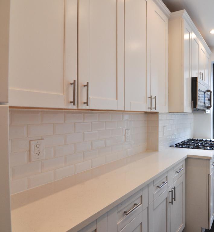 There is a separate windowed kitchen that has brand new renovations. New full sized GE stainless steel appliances, new dishwasher and new microwave, new white stone countertop with a new marble backsplash, abundant cabinetry and new grey slate stone floors.