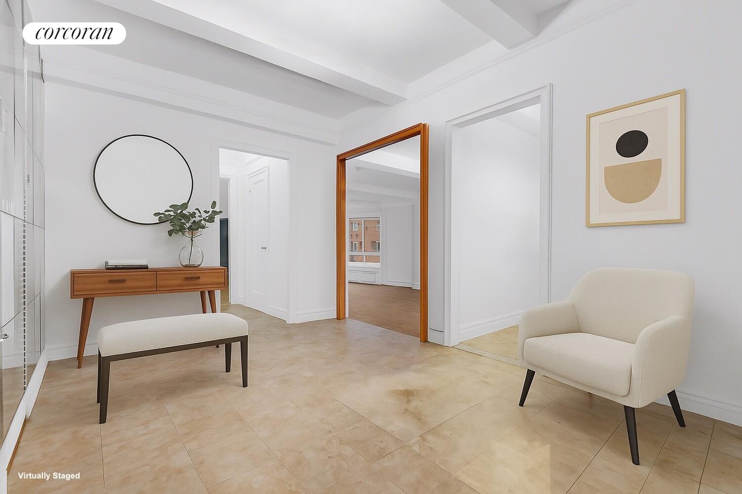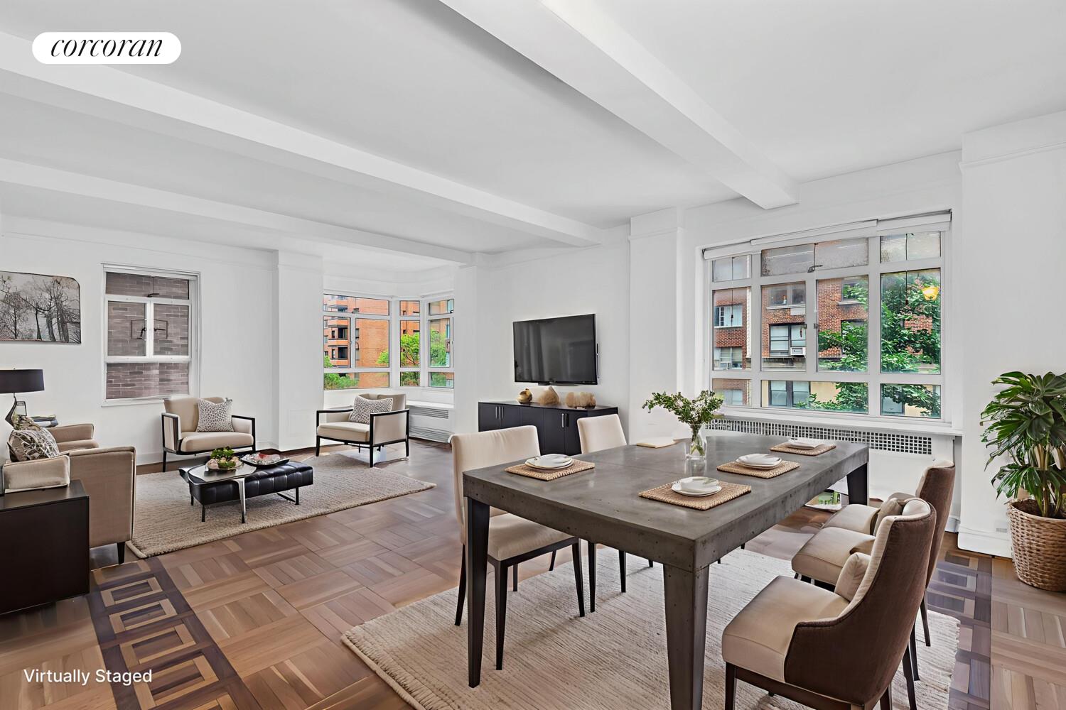 Upon entry, a formal foyer leads to an expansive dining gallery, offering an architectural layout ideal for elegant entertaining or quiet evenings at home. The sun-drenched living room is a true showpiece, anchored by dramatic corner windows with north and  east exposures. Original prewar details-including high beamed ceilings and classic moldings-remain intact, providing the perfect framework for a bespoke restoration.
