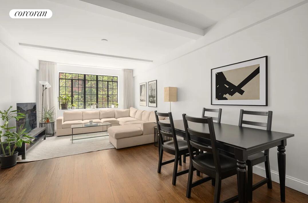 Welcome to Residence 502, a serene and spacious two-bedroom, two-bathroom home perched on the fifth floor of the iconic Essex House co-op. Blending pre-war charm with modern upgrades, this thoughtfully designed residence boasts high beamed ceilings, richly stained hardwood floors, and striking iron casement windows that fill the space with natural light.