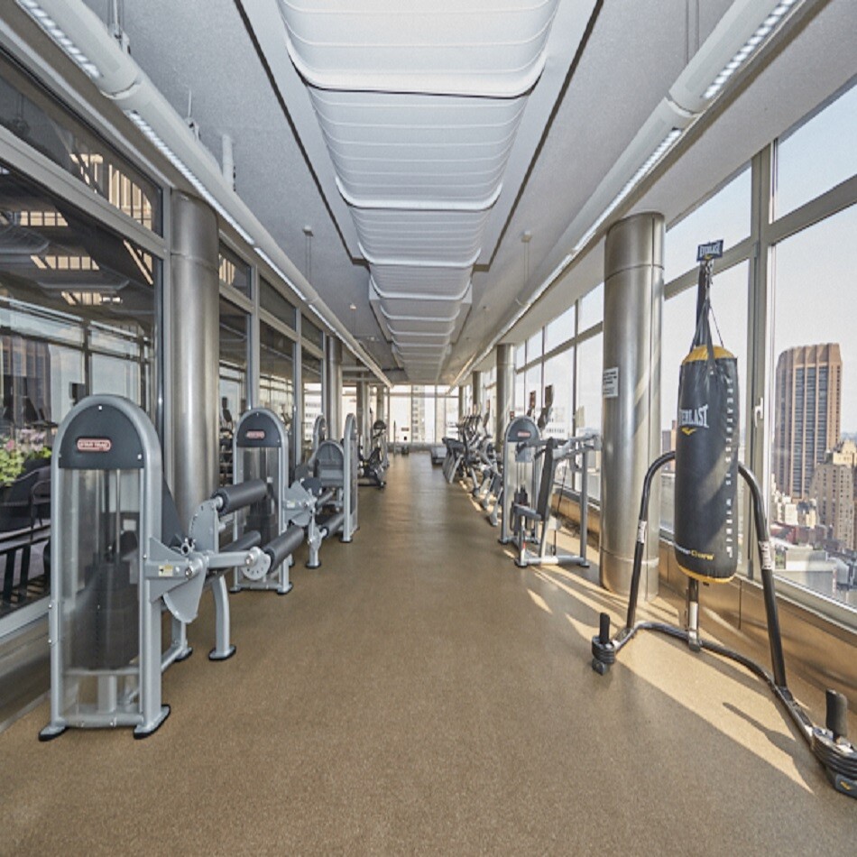 State-of-the-art gym on the 33rd floor featuring panoramic Manhattan views
