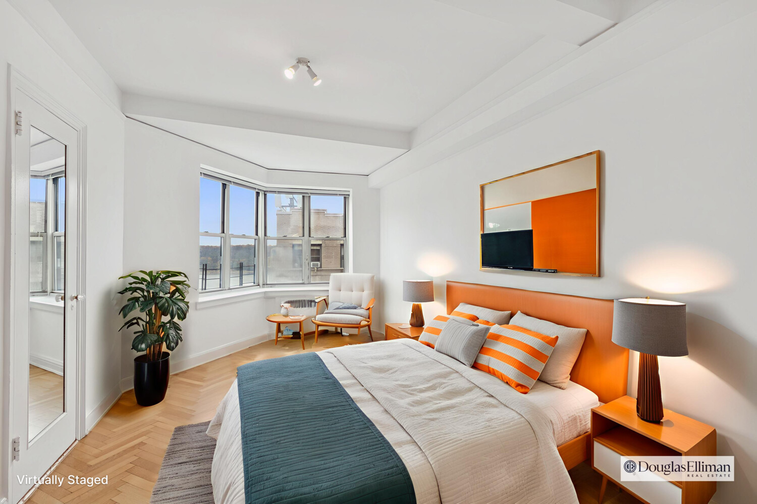 This home offers a loft-like feel and an elegant blend of period charm and modern comfort. Distinctive Art Deco details include beamed ceilings, graceful archways, picture rails, and just-refinished herringbone hardwood floors that bring timeless style to the space. The open kitchen provides abundant counter space and cabinetry -perfect for both cooking and entertaining. The comfortable bedroom features two closets and captivating Hudson River views, while south and west exposures fill the apartment with warm, natural light throughout the day.