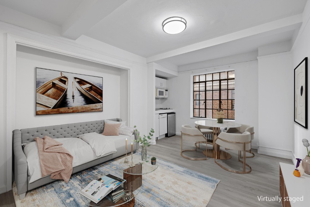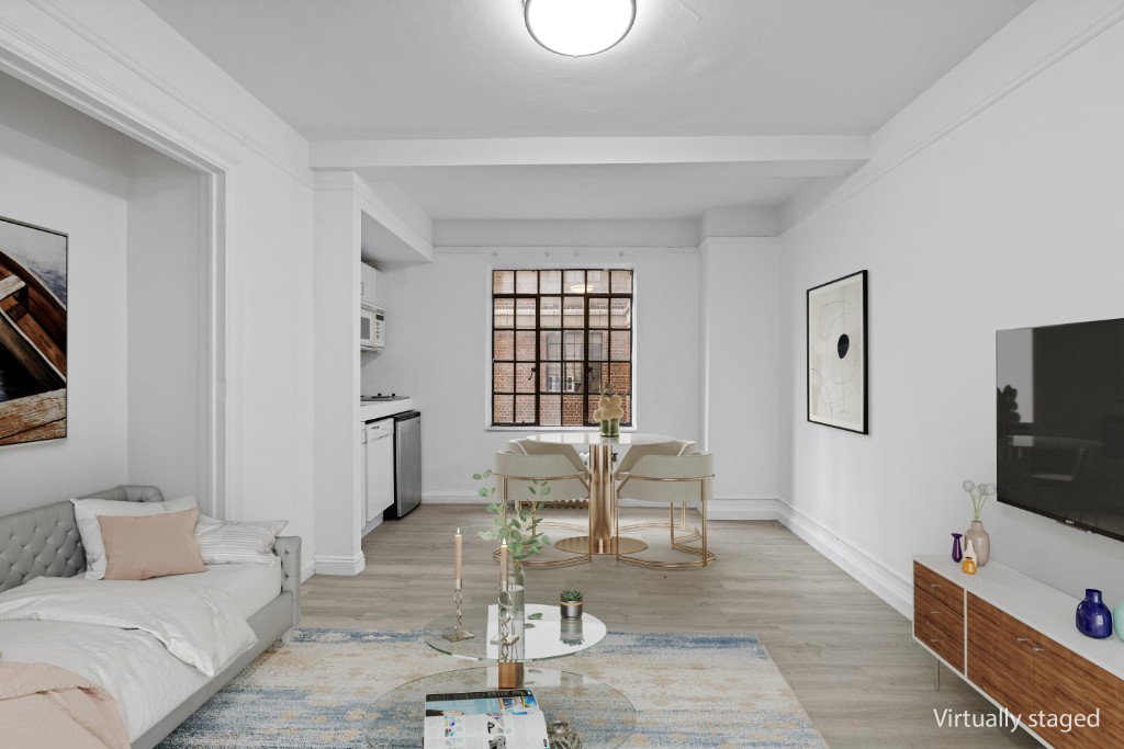 Beautiful high floor, recently renovated studio apartment with new modern floor in Tudor Tower, a charming full-service doorman building in Manhattan that is close to Grand Central Station and the Second Avenue Subway Station. There is a rooftop sun deck for residents with panorama views of the Midtown skyline. Monthly maintenance payment includes electricity, water, hot water and property taxes. The co-op building is flexible and permits co-purchasing, guarantors and pied-a-terres. Cats are welcome, but no dogs.