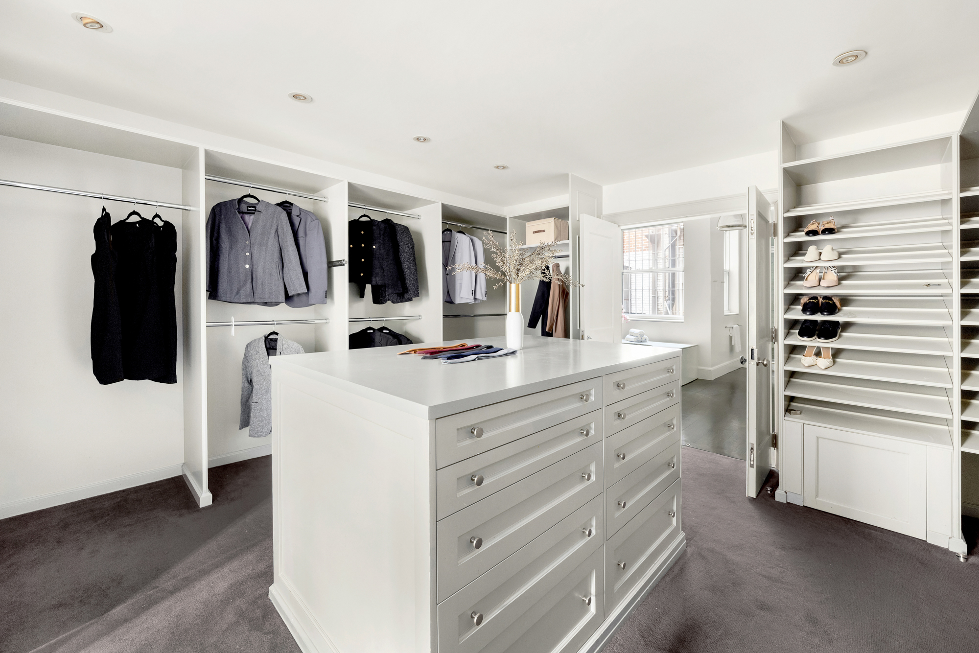 Upon entering through a handsome foyer, you are greeted by a spectacular great room with ceilings over 12 feet, an exposed brick wall, and a dramatic skylight flooding the space with natural light. The large eat-in chef’s kitchen opens onto a south-facing garden terrace and includes a discreet powder room. A custom wine vault, second powder room, and two coat closets complete the first level.