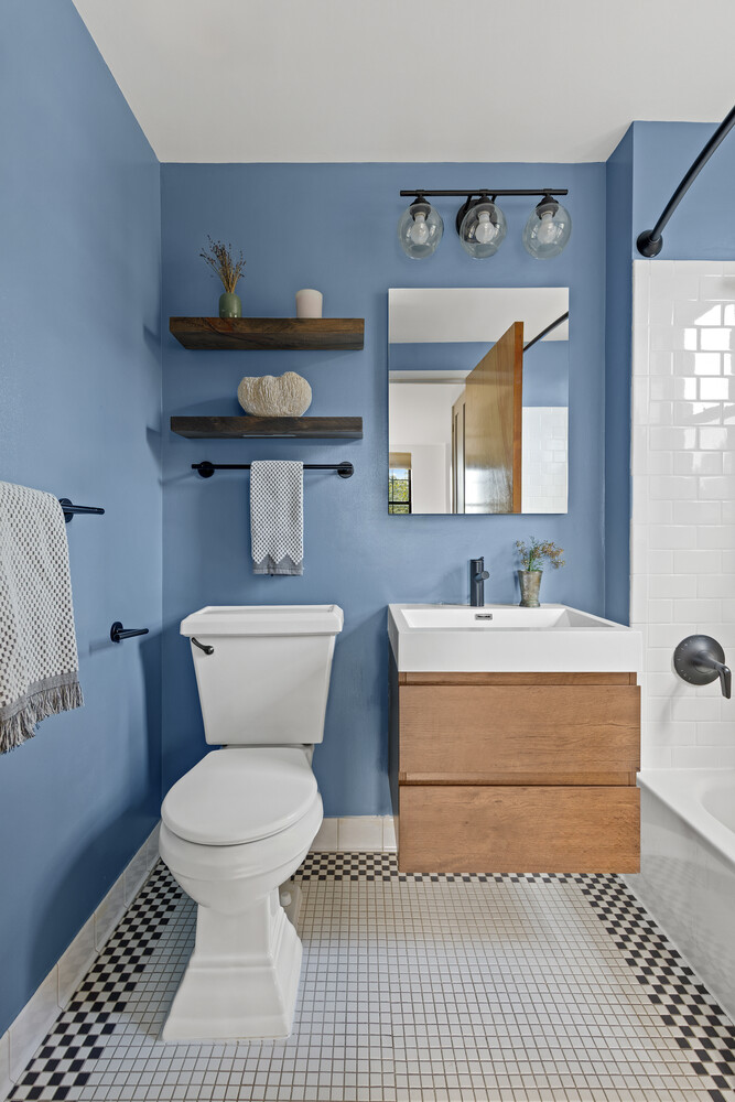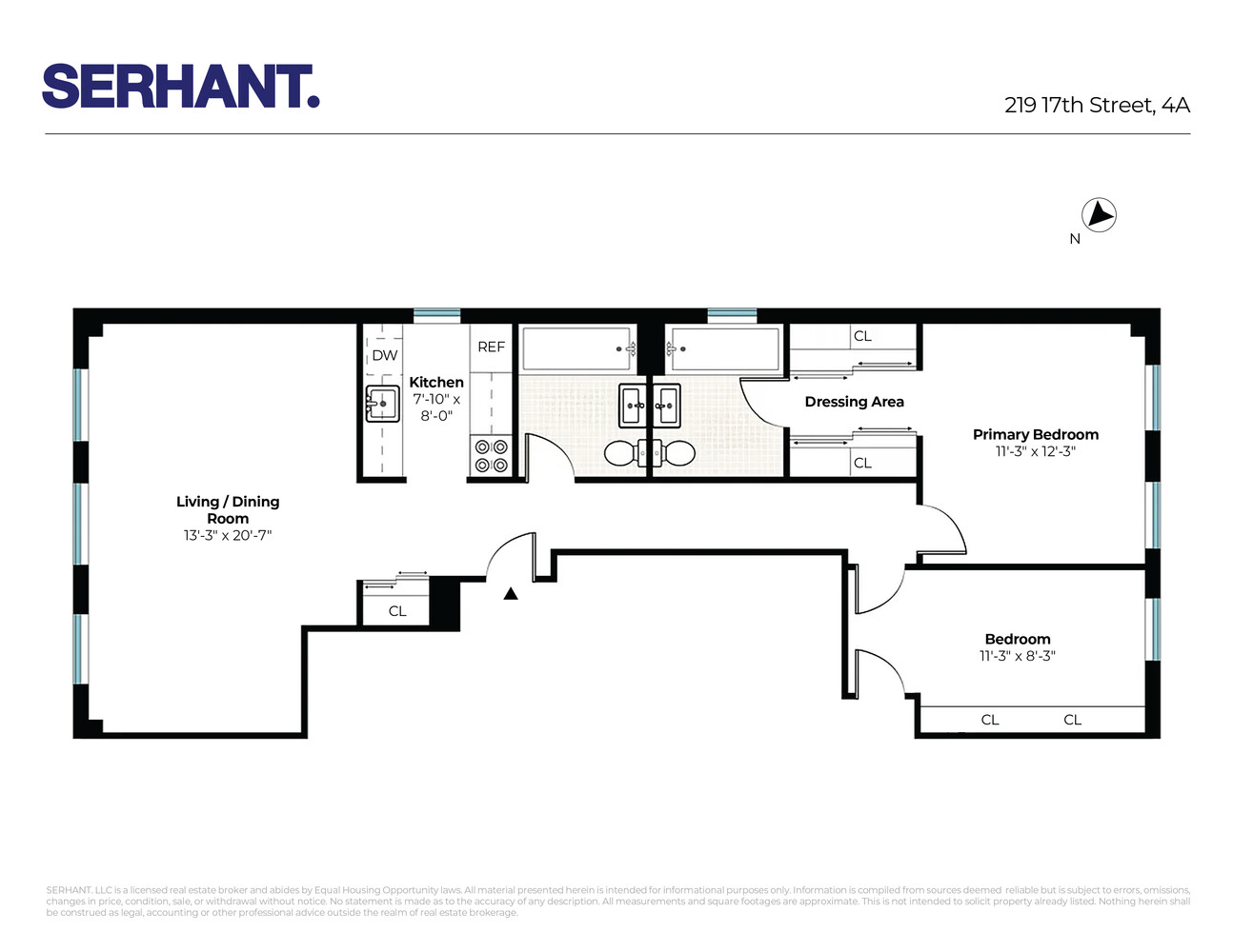 The primary suite offers a private retreat with a dressing area, en-suite bath, and double closets. The second bedroom is generously sized with excellent storage and includes a Murphy bed, allowing for flexible use as a guest room, office, or both. Hardwood floors, exposed brick, and multiple exposures add charm and texture throughout.